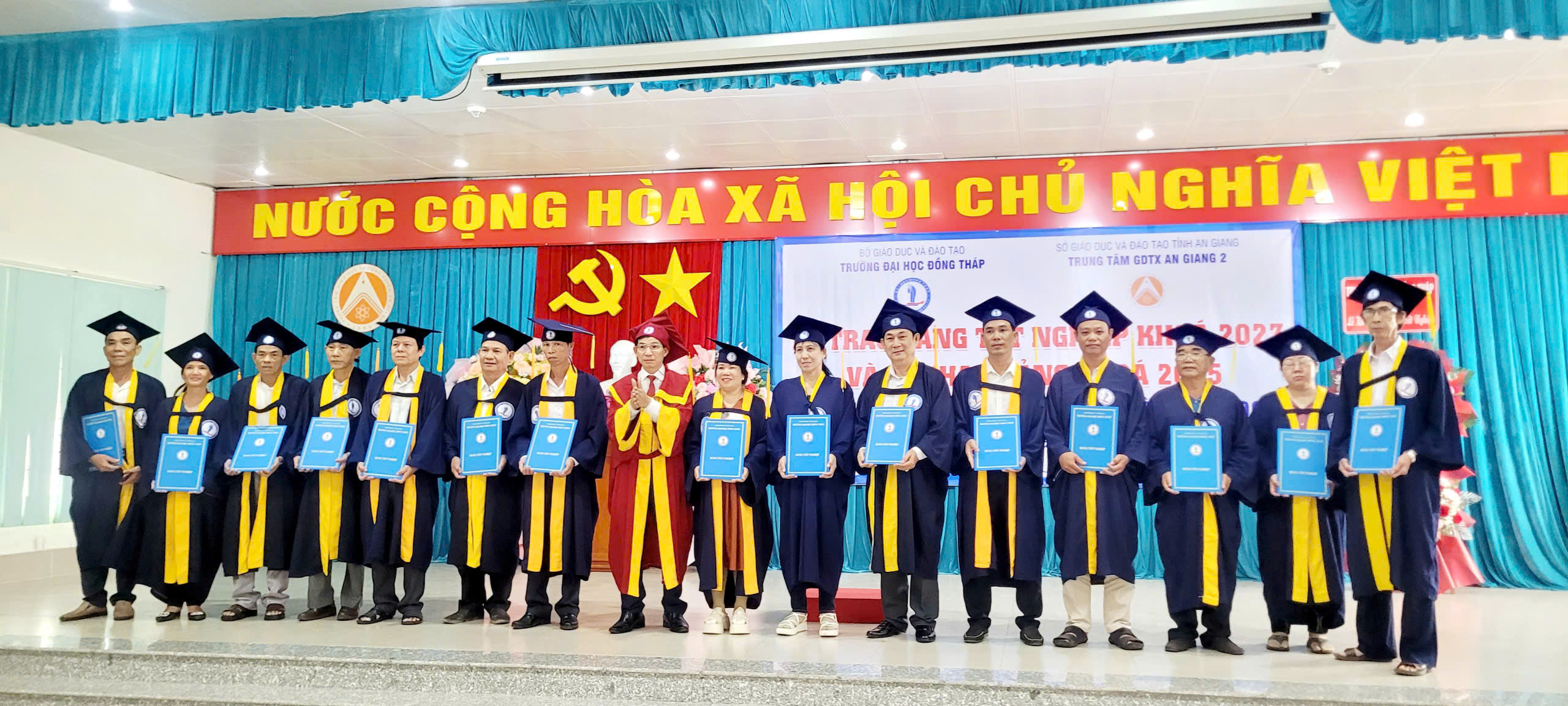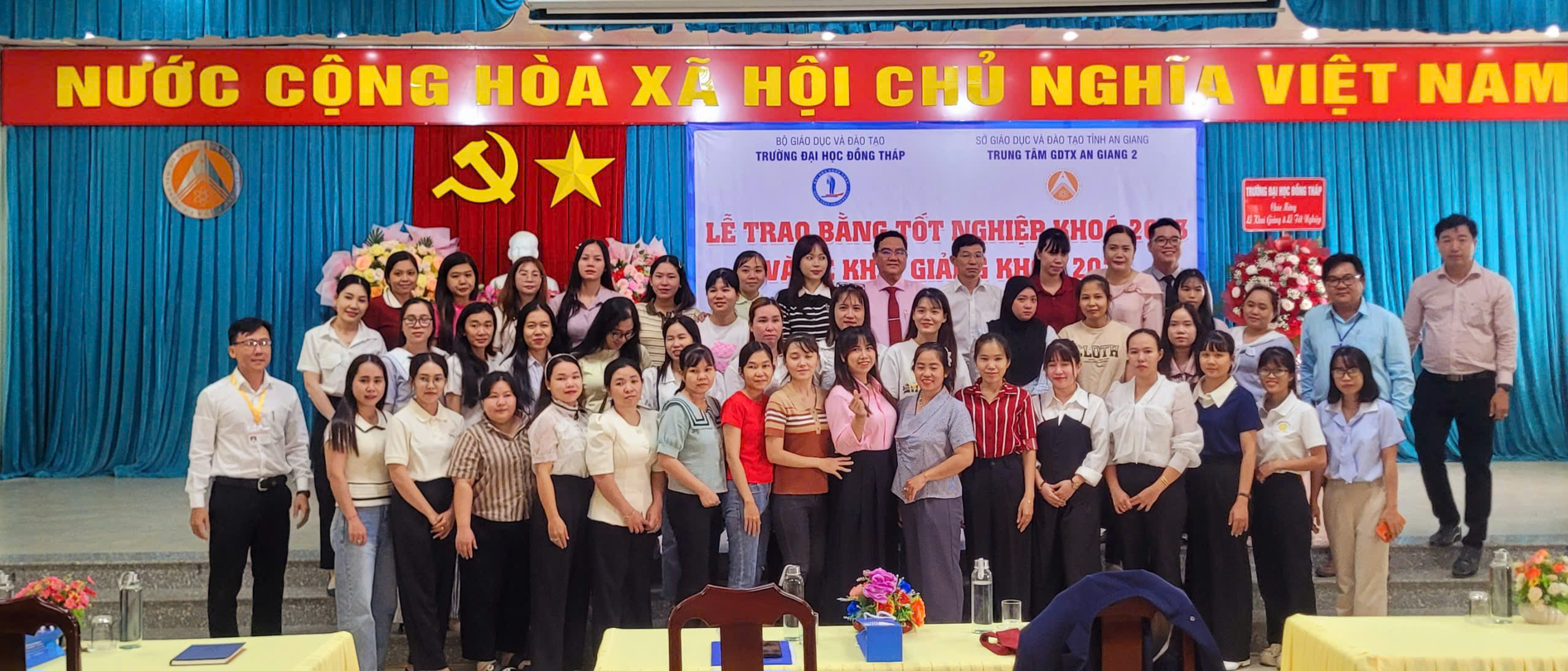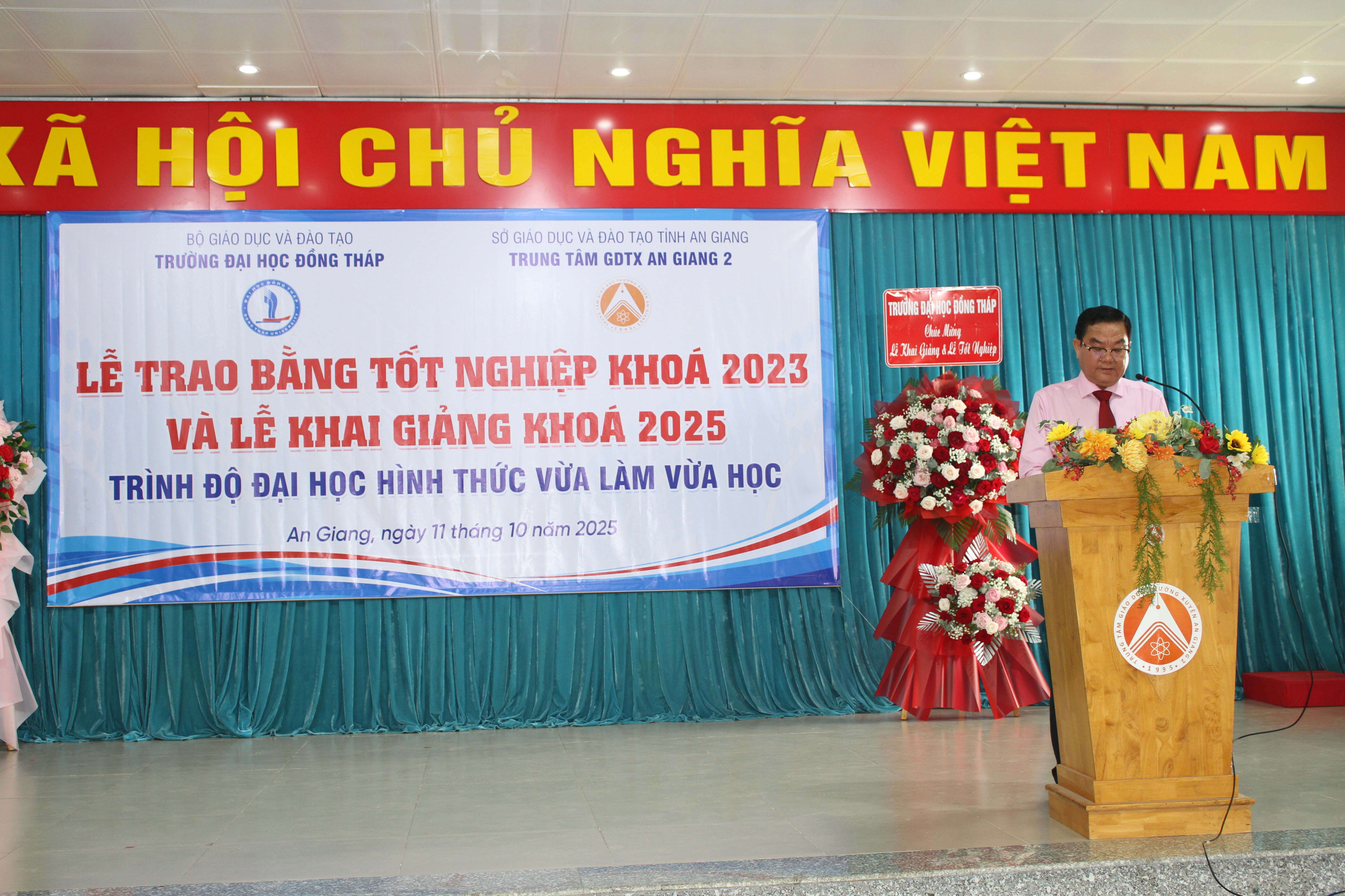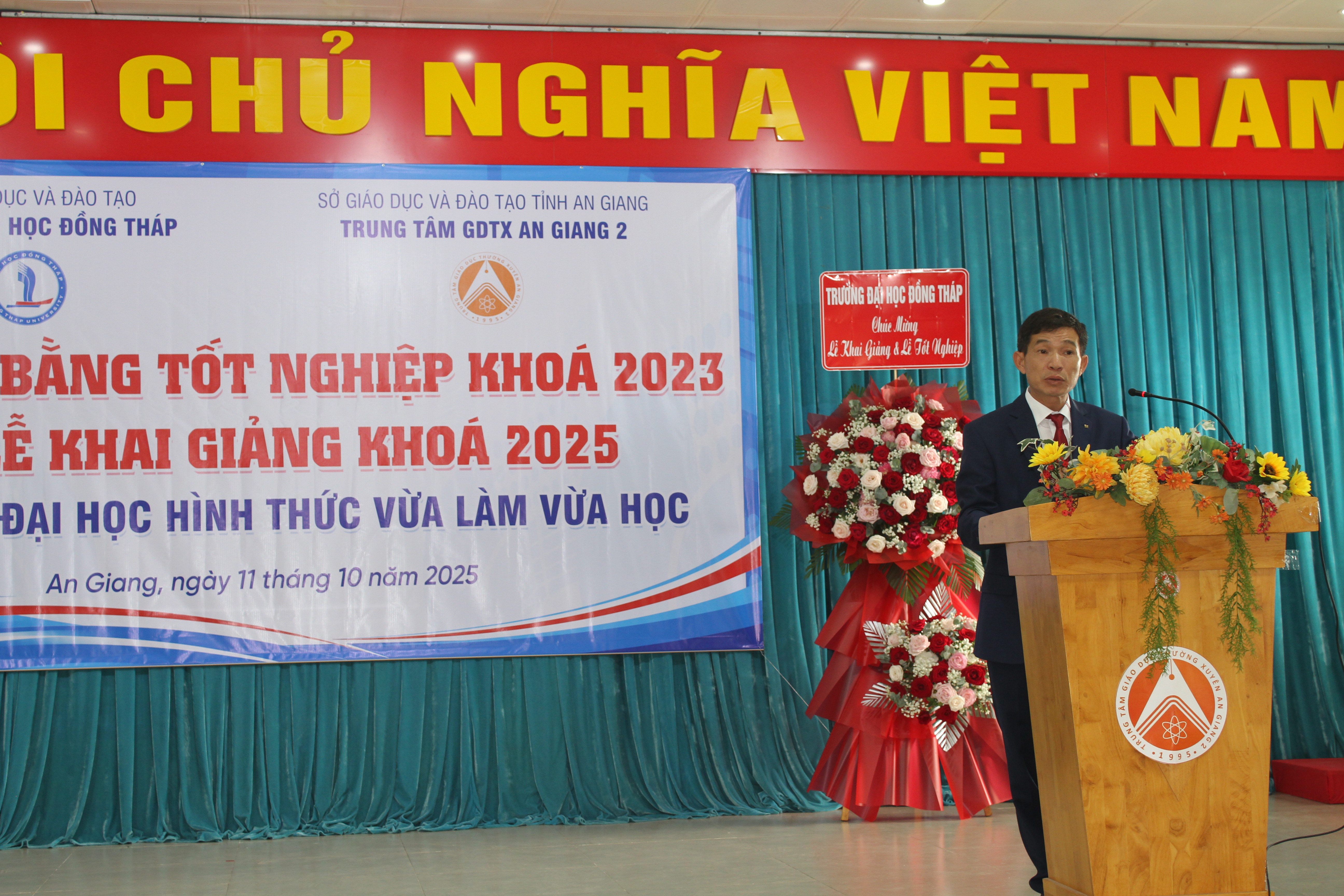 Phát biểu tại buổi lễ, đại diện lãnh đạo Đại học Đồng Tháp và Trung tâm Giáo dục thường xuyên An Giang 2 đã gửi lời chúc mừng nồng nhiệt đến các tân cử nhân, đánh giá cao tinh thần học tập và cống hiến của các học viên. Lãnh đạo cũng bày tỏ hy vọng rằng các tân cử nhân sẽ vận dụng sáng tạo những kiến thức, kỹ năng đã học vào thực tiễn công tác giảng dạy, góp phần vào sự nghiệp đổi mới và phát triển của ngành giáo dục tỉnh nhà.