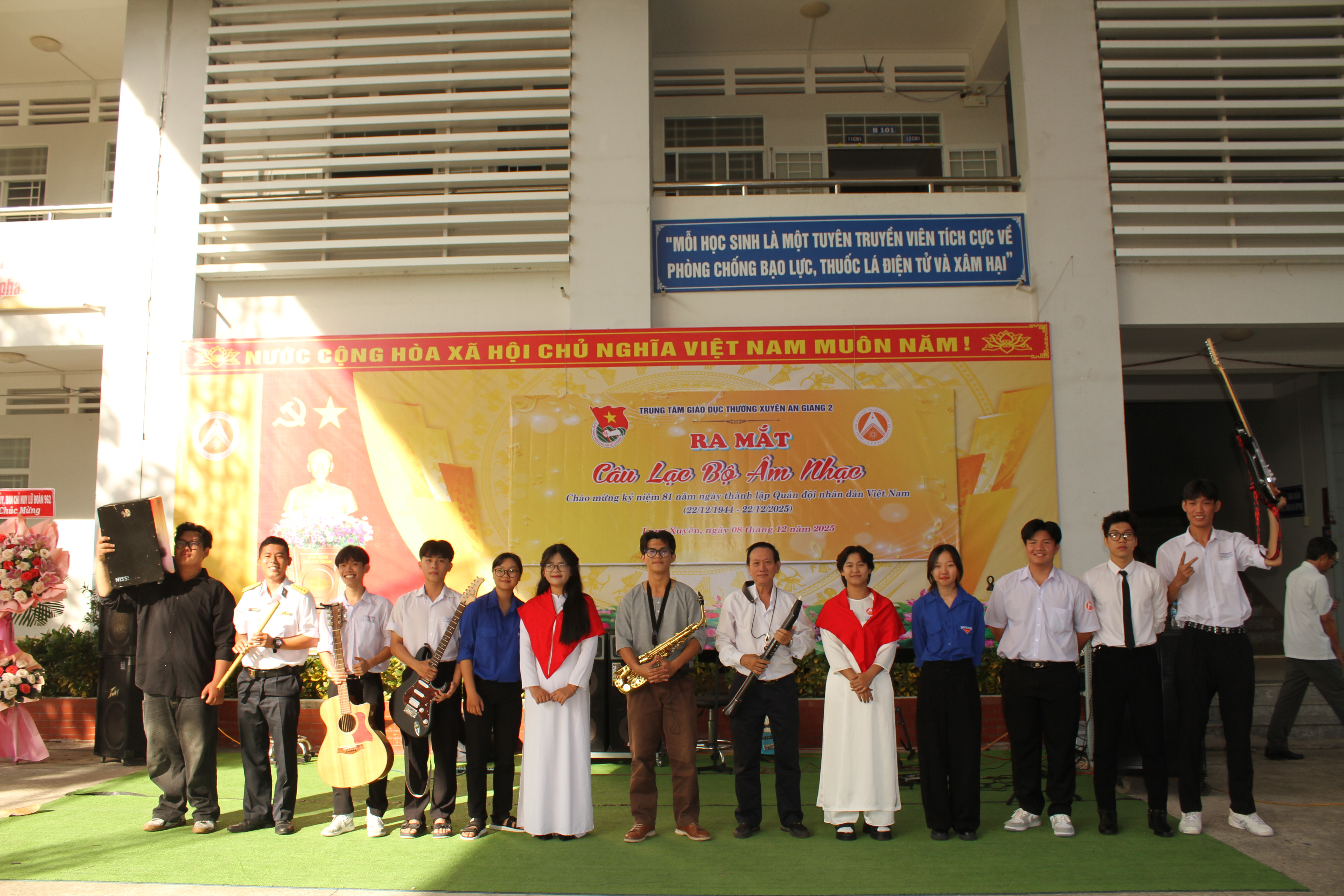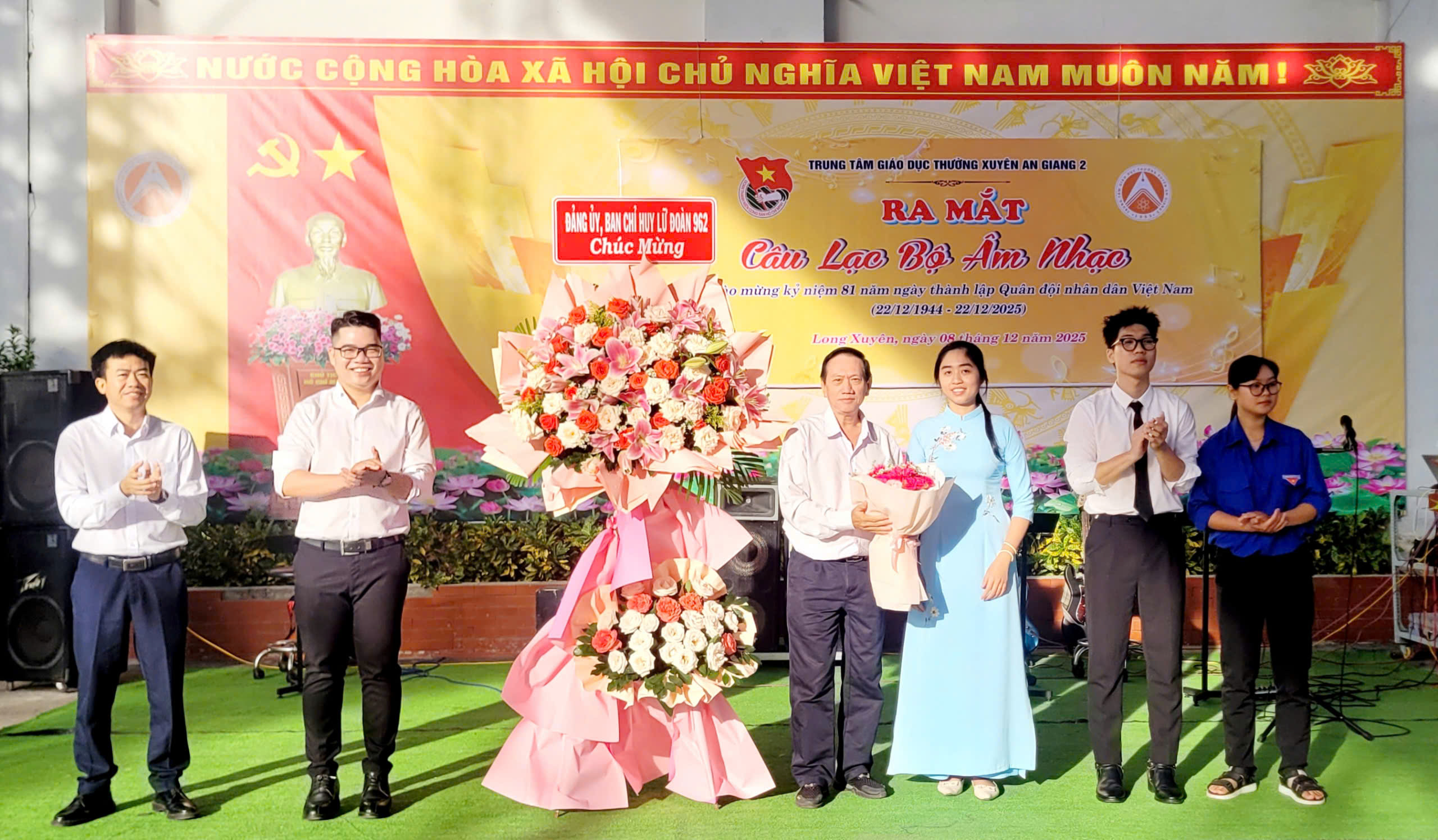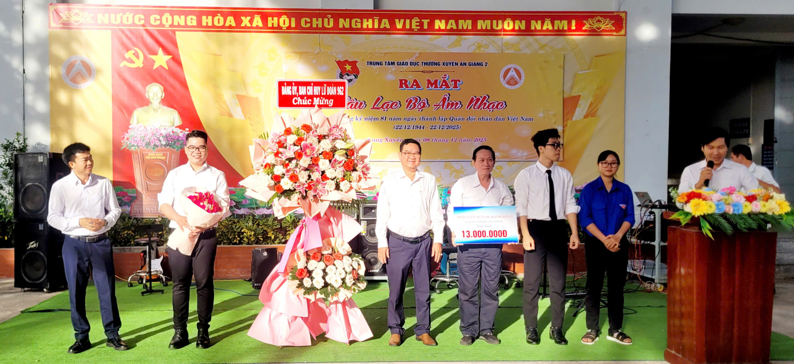 Sáng ngày 08/12/2025, trong không khí hào hùng thi đua lập thành tích chào mừng 81 năm Ngày thành lập Quân đội nhân dân Việt Nam và 36 năm Ngày hội Quốc phòng toàn dân, Trung tâm GDTX An Giang 2 đã long trọng tổ chức Lễ ra mắt Câu lạc bộ (CLB) Âm nhạc. Sự kiện có sự tham dự của đại diện Lữ đoàn 962, Ban Giám đốc, cùng toàn thể giáo viên và học sinh Trung tâm, đánh dấu sự ra đời của một sân chơi nghệ thuật chuyên nghiệp và ý nghĩa.