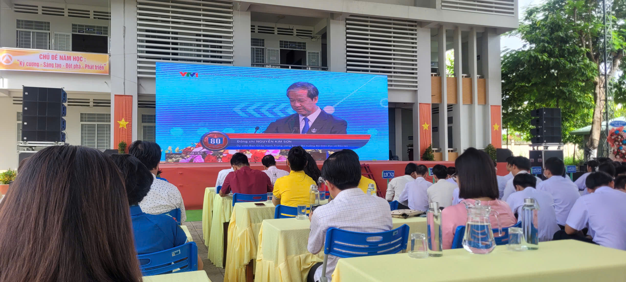 Từ 8 giờ 00 đến 9 giờ 30, buổi lễ đã trang nghiêm kết nối trực tuyến với điểm cầu chính tại Trung tâm Hội nghị Quốc gia. Toàn thể đại biểu, giáo viên và học sinh đã cùng thực hiện nghi thức Chào cờ, hát Quốc ca và lắng nghe diễn văn của Bộ trưởng Bộ Giáo dục và Đào tạo Nguyễn Kim Sơn. Những thước phim ý nghĩa về 80 năm phát triển của ngành giáo dục đã mang lại niềm tự hào sâu sắc. Đặc biệt, tất cả đã cùng lắng nghe lời phát biểu chỉ đạo và tiếng trống khai giảng năm học mới của Tổng Bí thư Tô Lâm, một khoảnh khắc thiêng liêng và đầy cảm xúc.